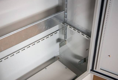 Покрытие и подготовка к монтажу: Корпус обработан антикоррозийным грунтом и окрашен полимерно-порошковой краской RAL 7035, устойчивой к УФ-излучению и перепадам температур. Внутренняя сторона двери оснащена перфорированным профилем (DIN-рейкой) с шагом 25 мм, что упрощает установку автоматических выключателей, УЗО и другого модульного оборудования.