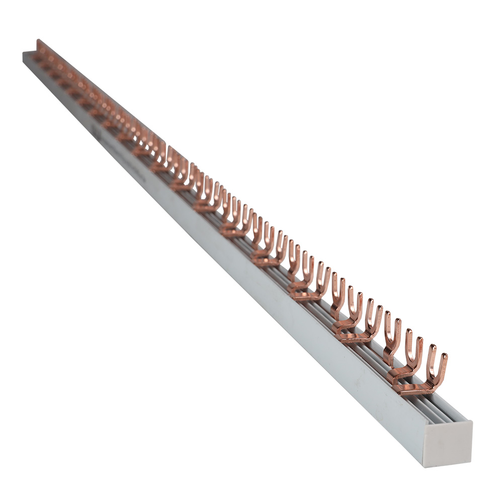 Шины соединительные представляют собой пластины, выполненные из меди, закрепленные в корпусе из диэлектрического материала, не поддерживающего горения и выпускаются стандартной длиной 1 метр. В наличии полный перечень шин для подключения 1, 2, 3, 4 полюсных устройств на токи до 100 А.